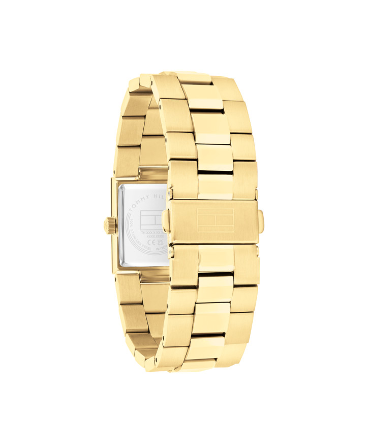 Часовник Tommy Hilfiger 1782787 впечатлява с модерен и минималистичен дизайн, подчертан от правоъгълен корпус и верижка от благородна стомана с жълто PVD покритие. Изчистеният циферблат с фини златисти стрелки и дискретно лого придава елегантност и изтънченост. Този модел е отличен избор за дамите, които търсят стилен и същевременно изискан аксесоар. Кварцовият механизъм гарантира точност, а международната гаранция от 2 години осигурява допълнително спокойствие.