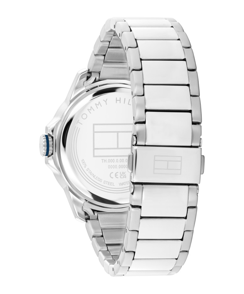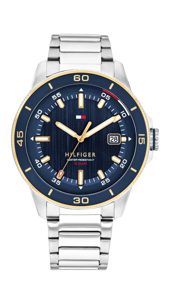 Часовник Tommy Hilfiger 1792229 съчетава модерен спортен стил и универсална елегантност в издръжлив дизайн от благородна стомана. Синият циферблат, комбиниран със златисти стрелки и индекси, създава ярък контраст и отлична четимост. Моделът разполага с индикация за дата, кварцов механизъм и минерално стъкло за защита при ежедневна употреба. Водоустойчивост 5 ATM и стоманената верижка го правят надежден и практичен избор за динамичен градски начин на живот.