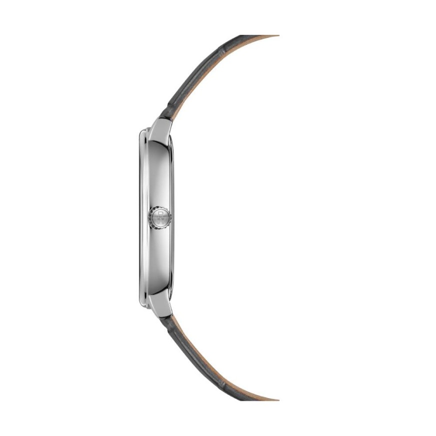 Моделът впечатлява с правоъгълен корпус от благородна стомана, сребрист циферблат с фини индекси и сива каишка от висококачествена телешка кожа.