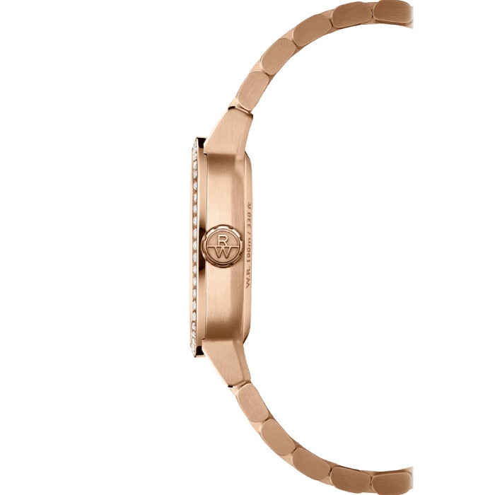 Часовник Raymond Weil Freelancer 2496-P5S-40051 въплъщава елегантност и съвършенство, комбинирайки класическа форма и модерна швейцарска технология. Квадратният корпус (34 × 34 мм) от стомана с PVD покритие в розово злато, инкрустиран с 60 лабораторно създадени диаманта (0.399 ct), придава луксозно излъчване. Циферблатът в цвят шампанско, декориран с W-мотив и лунна фаза, вдъхновена от изображение на NASA, подчертава женствената естетика. Сърцето на часовника е автоматичният механизъм RW4280 с 41-часов резерв на енергия. Моделът е защитен със сапфир кристал с антирефлексно покритие и е водоустойчив до 10 ATM – идеален баланс между елегантност и инженерна прецизност.