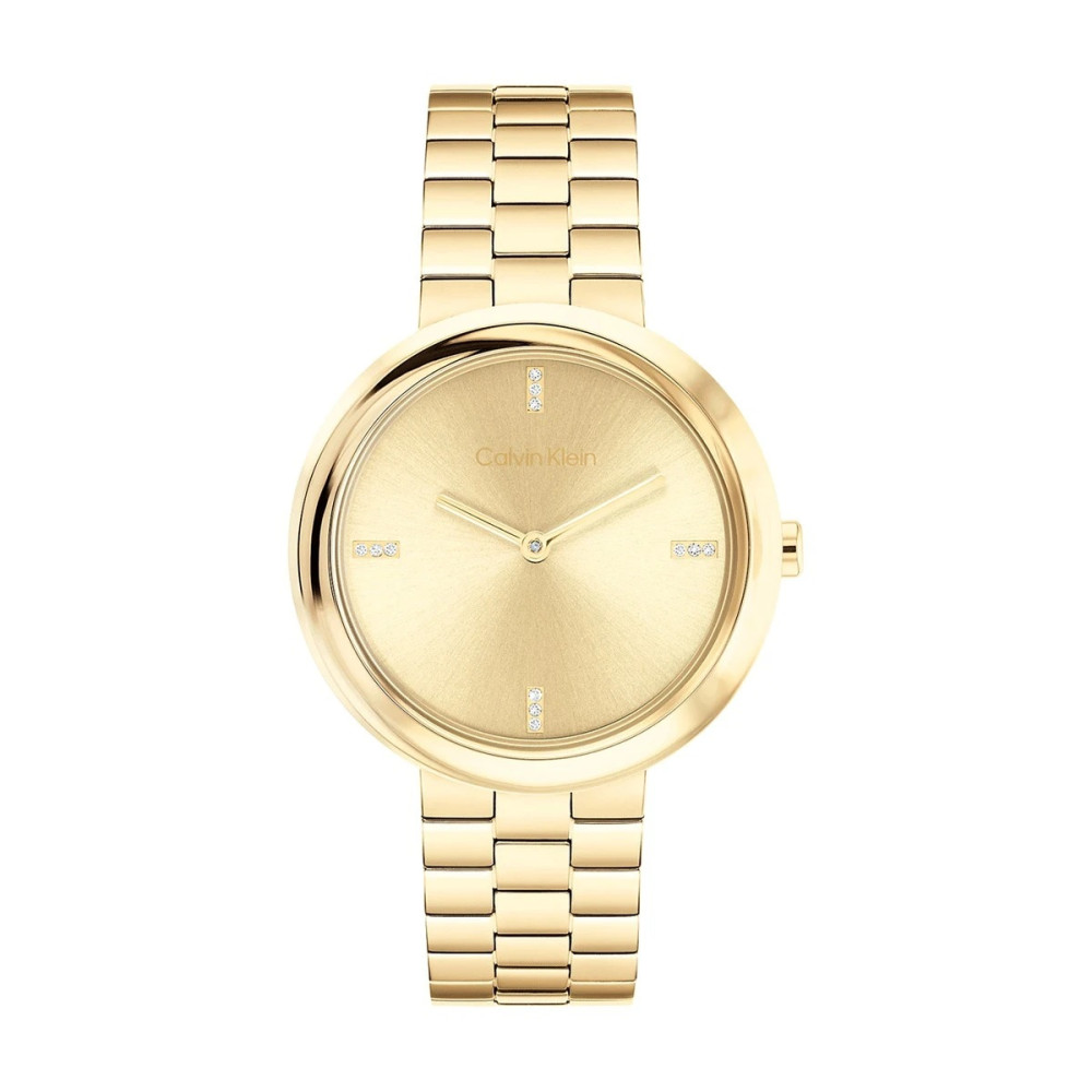 Calvin Klein 25100094 е изискан дамски часовник от колекцията Twisted, който впечатлява с цялостна златна визия и инкрустации, придаващи луксозен блясък. Корпусът и верижката са изработени от неръждаема стомана със златно покритие, а златният аналогов циферблат подчертава изтънчената естетика на модела. Минерал-кристалното стъкло осигурява защита от надрасквания, а водоустойчивостта до 3 ATM го прави подходящ за ежедневна употреба и официални поводи.