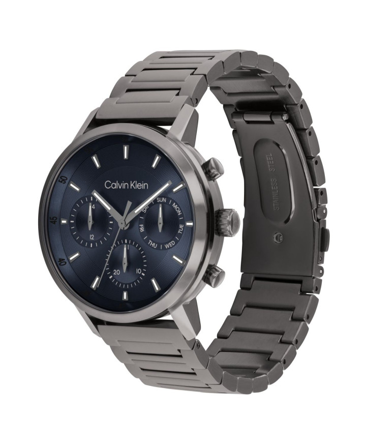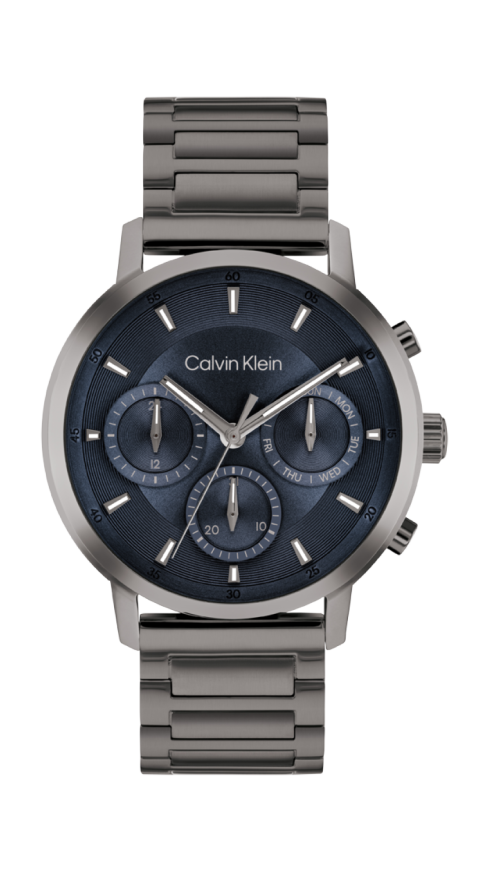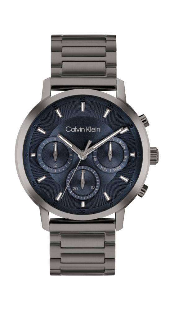 Часовник Calvin Klein 25200495 – мъжки спортен кварцов модел с корпус от неръждаема стомана със сиво PVD покритие и диаметър 42 мм. Елегантният тъмносин циферблат с функции за ден, дата и 24-часов формат съчетава стил и практичност. Минералното стъкло предпазва от надрасквания, а металната верижка гарантира комфорт и издръжливост. Водоустойчивост до 3 ATM осигурява защита при ежедневна употреба. Перфектен избор за модерния мъж, който търси баланс между визия и функционалност.