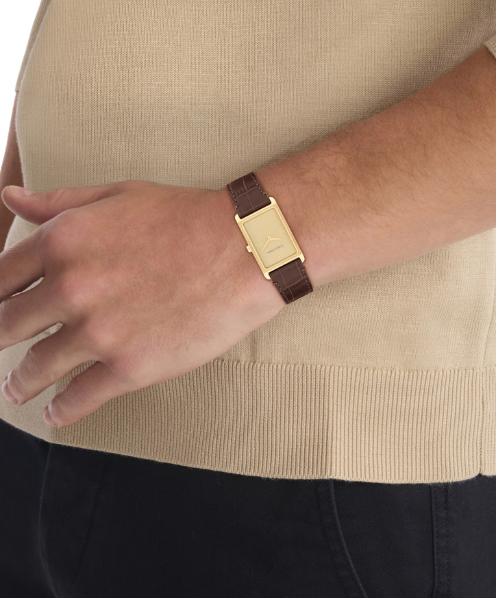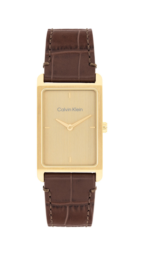Часовник Calvin Klein 25200530 впечатлява с изчистена елегантност и минималистична визия, характерна за модната естетика на марката. Корпусът от благородна стомана с жълто PVD покритие и диаметър 24 mm създава фин и стилен силует, подходящ за ежедневни и официални визии. Аналоговият циферблат подчертава минимализма на модела, а кожената каишка осигурява комфорт и класическо усещане. Минералното стъкло гарантира надеждна защита, а кварцовият механизъм Seiko Instruments Inc. осигурява точност. С водоустойчивост 3 ATM часовникът е идеален за ежедневна употреба.