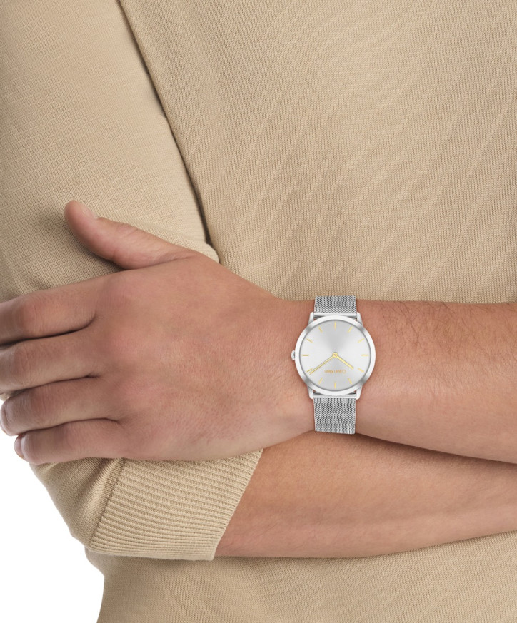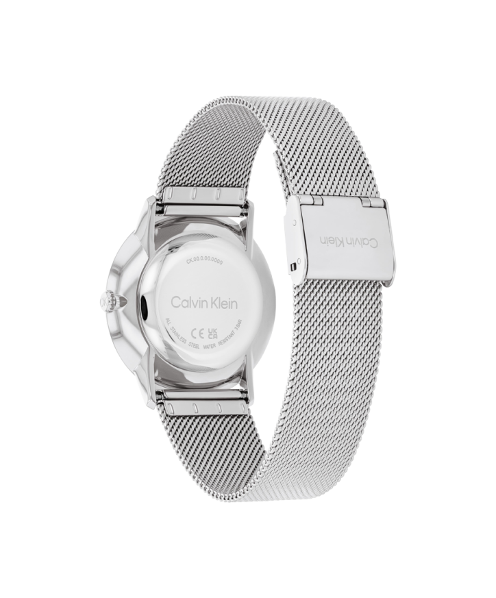 Calvin Klein 25300001 е стилен унисекс часовник с минималистична визия и прецизен кварцов механизъм. Корпусът и фината mesh верижка са изработени от неръждаема стомана, осигуряваща удобство и адаптивност към китката. Сребристият циферблат е хармонично допълнен от златисти стрелки и индекси, придаващи топъл и елегантен акцент. Универсален модел, подходящ както за жени, така и за мъже.