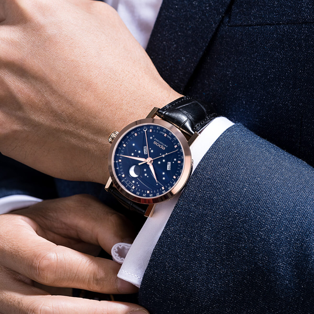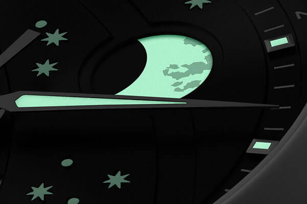 Той впечатлява с голяма луминесцентна луна и звезди, изобразени върху син Sunray циферблат, който прелива в дълбоки небесни нюанси.