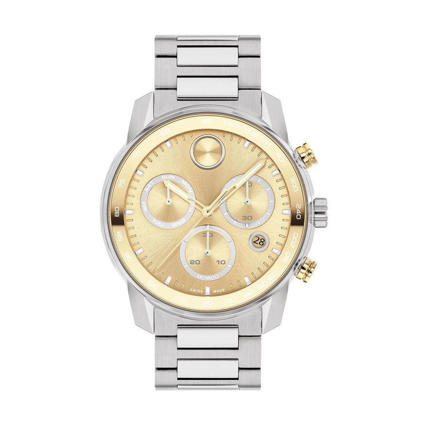 Часовник Movado 3600907 е стилен мъжки кварцов хронограф от колекцията Bold Verso със златист циферблат, тахиметрична скала и стоманена верижка. Поръчай оригинален Movado от ClassicWatches.bg с гаранция!