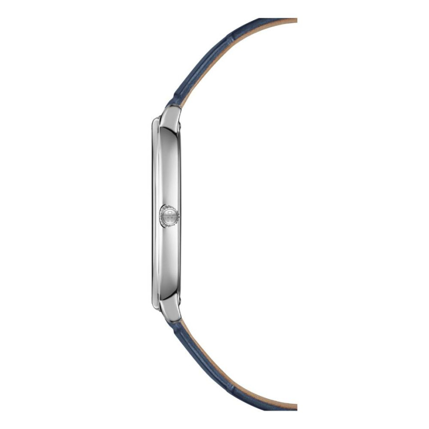Моделът впечатлява с овален корпус от благородна стомана и син циферблат, който излъчва изтънченост и стил.
