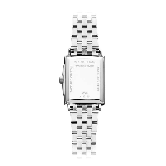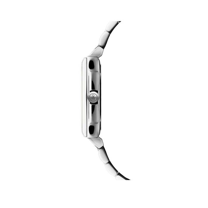 Raymond Weil Toccata 5925-ST-00300 е изискан дамски часовник, съчетаващ класическа елегантност и съвременна швейцарска прецизност. Моделът разполага с правоъгълен корпус от 316L неръждаема стомана (22.6 x 28.1 мм), бял циферблат с римски цифри и прозорец за дата на 3 часа, придаващи изтънчен и женствен характер. Тънкият му профил от едва 6.25 мм и кварцовият механизъм осигуряват комфорт и надеждност при ежедневна употреба. Защитен със сапфир кристал, моделът е устойчив на надраскване, а водоустойчивостта до 5 ATM го прави подходящ за всекидневно носене.
