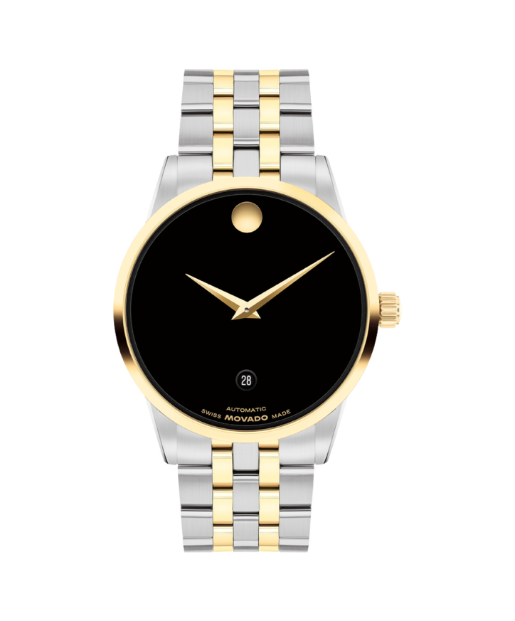 Часовник Movado 608036 е елегантен мъжки модел от престижната колекция Museum Classic, отличаваща се с неподвластен на времето минимализъм. Корпусът и верижката от благородна стомана са подчертани с елементи с жълто PVD покритие, които придават фин луксозен акцент. Черният циферблат със златиста точка при 12 часа и златисти стрелки е емблематичната визия на Movado. Моделът разполага с индикация за дата и е защитен със сапфир-кристал, а швейцарският автоматичен механизъм гарантира надеждност и висока точност. С водоустойчивост 3 ATM този часовник съчетава стил, изящество и практичност за ежедневието.