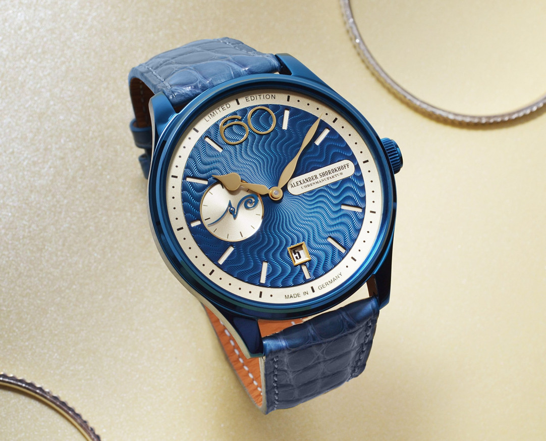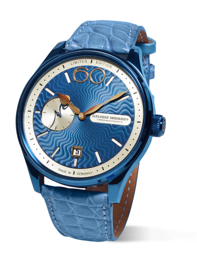 Часовник ALEXANDER SHOROKHOFF NEVA AS.NEV02-3 е лимитиран мъжки модел с ръчно навиване, вдъхновен от мощта и красотата на река Нева. Синият гилоширан циферблат с форма на вълни и стрелка “N” придава артистична дълбочина. Корпусът е с PVD покритие, сапфирено стъкло и кожена каишка. Произведен в само 49 броя, този модел съчетава руска емоция с немска прецизност и ръчно гравиран механизъм.