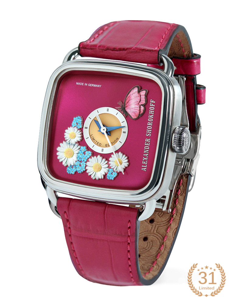 Часовник ALEXANDER SHOROKHOFF SUMMER AS.AP.SOM2 е лимитиран дамски модел с автоматичен механизъм ETA 2000-1, вдъхновен от сезона на светлината. С квадратна каса 36x36 мм, бордо циферблат със 3D флорални и пеперудени апликации и елегантна крокодилска каишка, този модел е последният от колекцията „Сезони“. Лимитиран до 31 броя – наличен в ClassicWatches.bg.