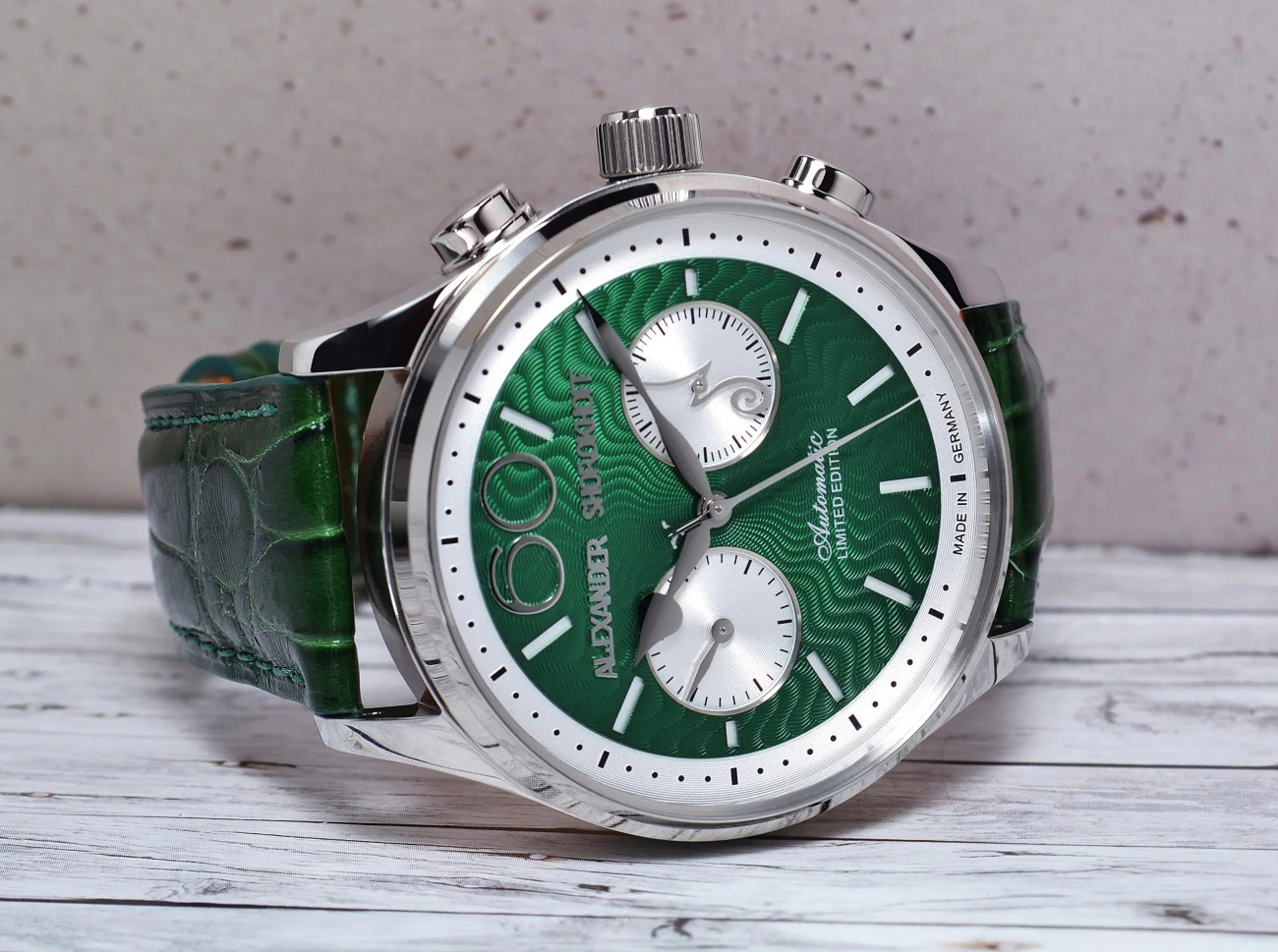 Часовник ALEXANDER SHOROKHOFF NEVA CHRONO AS.CA05-NEV5 е лимитиран мъжки автоматичен хронограф с изумителен зелен гилоширан циферблат и корпус от благородна стомана. Моделът разполага с калибър 2030.AS, 38 часа резерв и ръчно гравиран ротор. Вдъхновен от река Нева и духа на Санкт Петербург, този часовник съчетава дръзка визия, техническо майсторство и лимитирана ексклузивност – само 100 броя за целия свят.