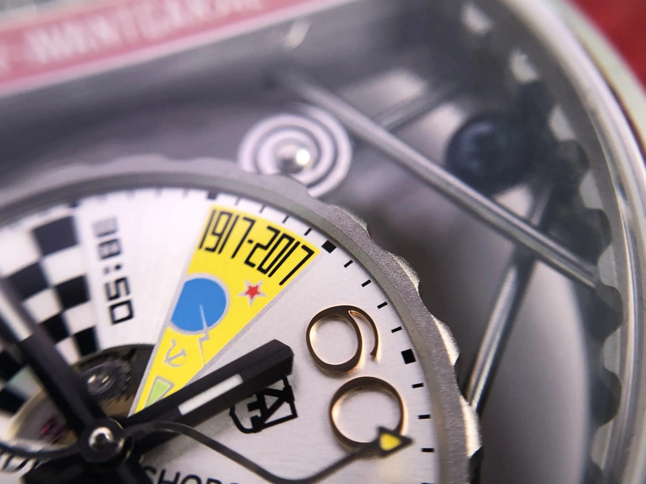 Задната част на корпуса е емайлирана с допълнителна информация за часовника. Роторът на автоматичният механизъм е гравиран и усъвършенстван ръчно.