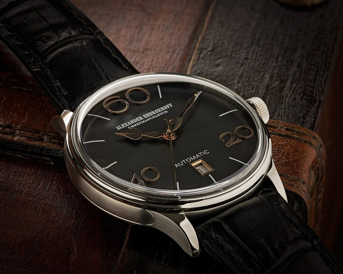 Часовник ALEXANDER SHOROKHOFF SIXTYTHREE AS.LA02-4 е ретро вдъхновен модел с черен циферблат и розово позлатени стрелки, напомнящ духа на 60-те години. Корпусът от благородна стомана е допълнен от цилиндрично сапфирено стъкло с антирефлексно покритие, което подчертава извития дизайн. Автоматичният механизъм 2892.AS осигурява 47 часа резерв. Моделът е унисекс, с кожена каишка с крокодилска шарка и водоустойчивост 50 м – идеален за ценители на стилната класика.