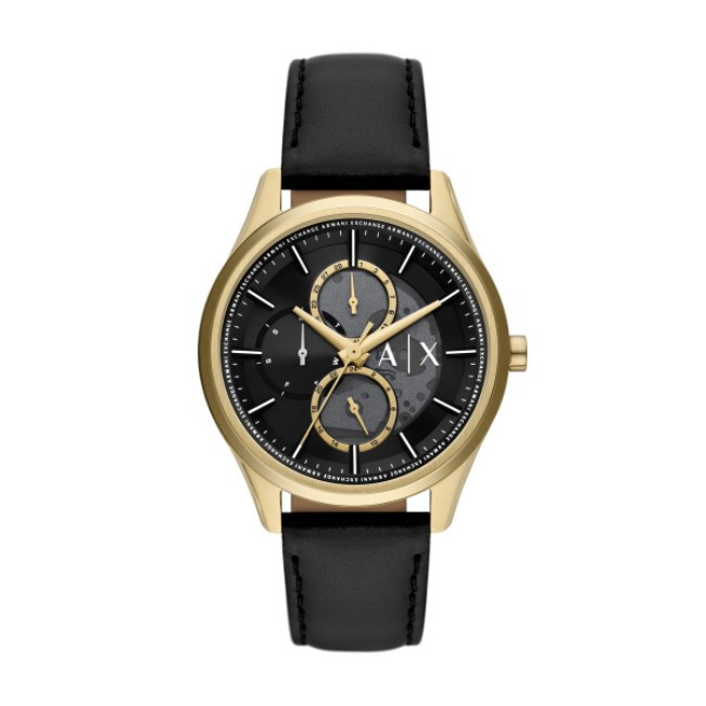 Armani Exchange AX1876 от колекция Dante e мъжки кварцов часовник с черен кръгъл циферблат, златист корпус от неръждаема стомана с широчина 42 mm и черна каишка 20 mm, изработена от pro-planet кожа.