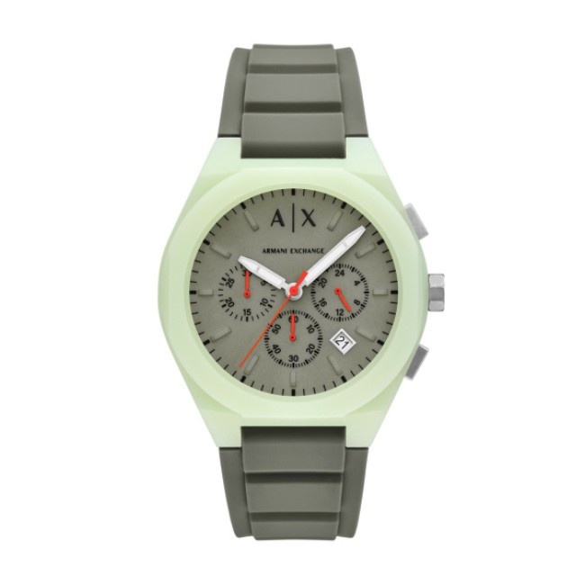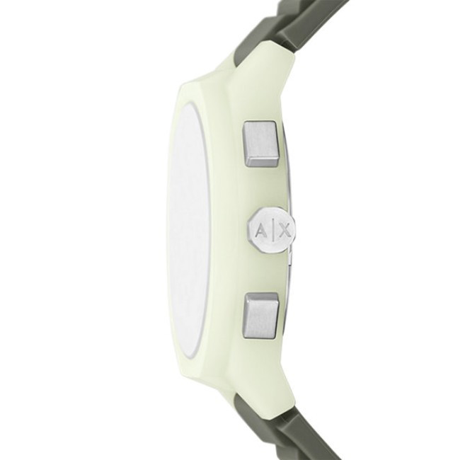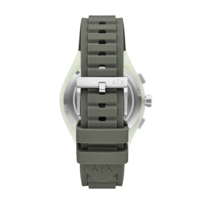 Мъжки Часовник Armani Exchange AX4171   Armani Exchange AX4171 от колекция Sync e мъжки кварцов часовник със зелен кръгъл циферблат, зелен корпус от полимер с диаметър 44 mm и зелена каишка 17 mm, изработена от силикон.