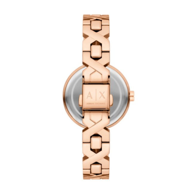 Дамски Часовник Armani Exchange AX5832   Armani Exchange AX5832 от колекция e дамски кварцов часовник с розовозлатист кръгъл циферблат, розовозлатист корпус от неръждаема стомана с диаметър 32 mm и розовозлатиста верижка 12 mm, изработена от неръждаема стомана.