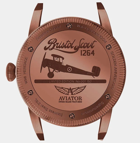Всеки AVIATOR часовник носи своя собствена история, вдъхновена от авиацията. Обърнете AVIATOR Bristol Scout и ще откриете гравирани детайли и спираловидни линии на задния капак – почит към легендарния самолет и неговите достижения. Винтидж шрифтът използван за надписите, в съчетание с пясъкоструената и полирана повърхност, придава на задния капак изискан и уникален завършек. Освен с оригинален външен вид, корпусът се отличава и с водоустойчивост до 100 метра, гарантирайки надеждност дори в най-предизвикателните условия.