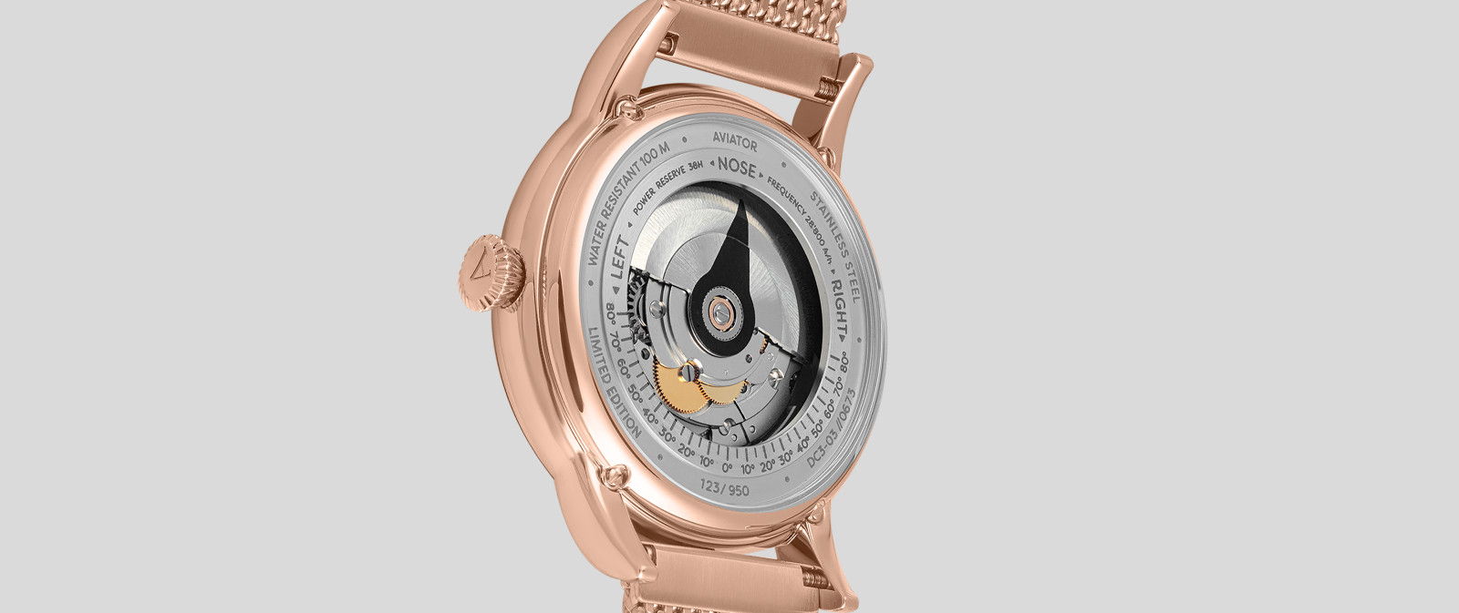 Задният капак на корпуса е вдъхновен от прибора за управление на кормилото в пилотската кабина на Douglas DC-3. Той отразява функционалността, която изчислява ъглите на отклонение на кормилото и контролира позицията на самолета. Тази уникална детайлност е защитена със специално стъкло, което предпазва от надрасквания и удари, като същевременно осигурява комфортно прилягане на китката. Всеки AVIATOR Douglas е създаден с изключително внимание към детайлите – комбинация от авиационно наследство и фино часовникарско майсторство, неподвластна на времето.