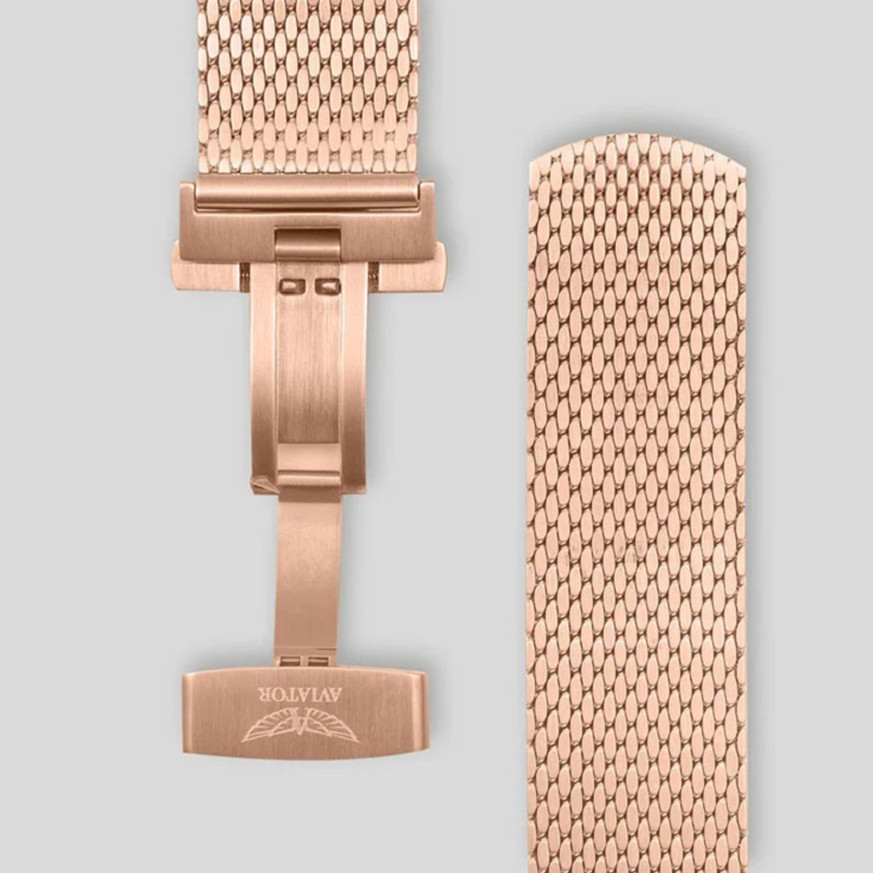 Изработена от най-качествени материали, всяка каишка AVIATOR е създадена, за да отразява духа на колекцията. Този модел разполага с луксозна каишка от кожа с алигаторски мотив, преминала специален процес на дъбене, за да осигури мека текстура и гъвкавост.