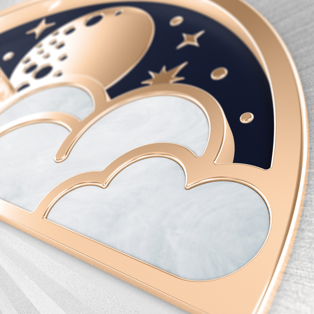 Циферблатът въплъщава върховете на Ар Деко стила – изискана симетрия, бляскав слънчев гилош и диамантено финиширани индекси. Истински седеф създава мистична дълбочина, а лунният диск, обрамчен в облачни мотиви и 3D дизайн, приканва погледа да се изгуби в хоризонта. Дори полираните нитове по ръба на минутния ринг носят ехо от легендарните самолети на Златната ера на авиацията.