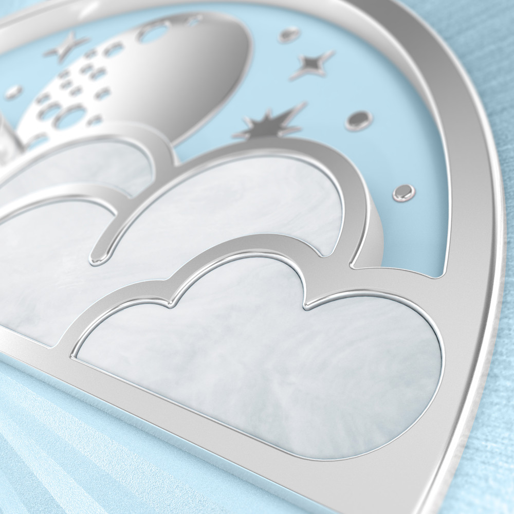 Истинското вълшебство се крие в детайлите. Луната разкрива тайните си през облачния воал – същите тези облаци, които служат като прозорец към нейните фази, са фино украсени с автентичен седеф. Със своя загадъчен блясък, той е като намигване към класическия шик на 30-те години – като наниз от нежни перли, допълващи винтидж очарованието на това уникално бижу. Играта на светлината върху седефа напомня за лунните отблясъци в нощното небе – променливи, непредсказуеми и хипнотизиращи.