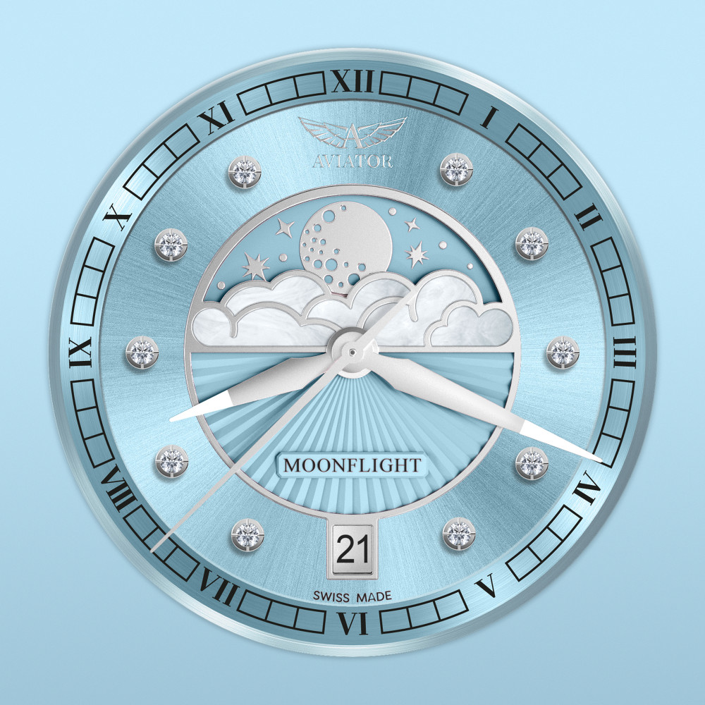 В сърцето на този часовник тупти надежден швейцарски кварцов механизъм с живот 60 месеца. Сложната му фаза на луната е акцентирана с деликатни полирани и метализирани детайли, осигуряващи абсолютна прецизност. Благодарение на този механизъм AVIATOR MoonFlight ще ви държи в идеален синхрон с лунния цикъл – от новолуние до пълнолуние и обратно.