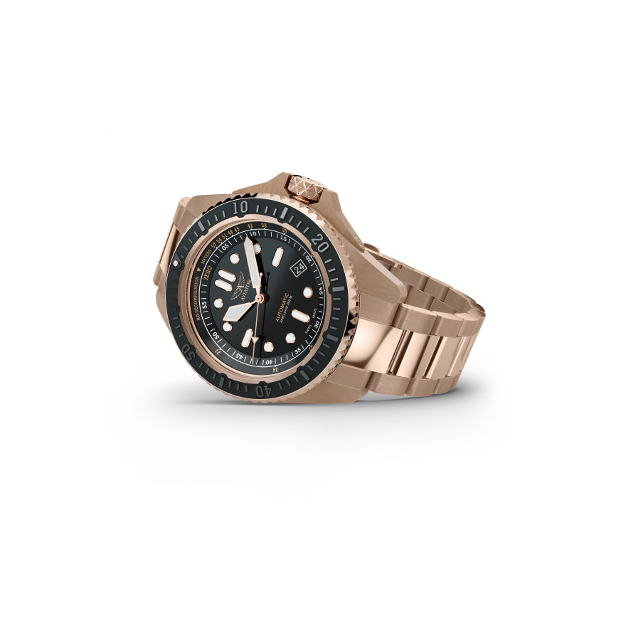 Часовник Aviator V.1.43.2.363.5 е елегантен швейцарски автоматичен модел с корпус и верижка от неръждаема стомана с покритие от розово злато. Захранван от механизма Sellita SW200-1, моделът предлага резерв на мощност до 38 часа, отлична точност и надеждност. Черният емайлиран циферблат с апликирани метални индекси и SuperLuminova покритие гарантира отлична видимост при всякакви условия. Корпусът с диаметър 42.8 мм е защитен със сапфирен кристал с антирефлексно покритие. Водоустойчивостта до 300 м го прави подходящ както за гмуркане, така и за ежедневна употреба с усещане за лукс