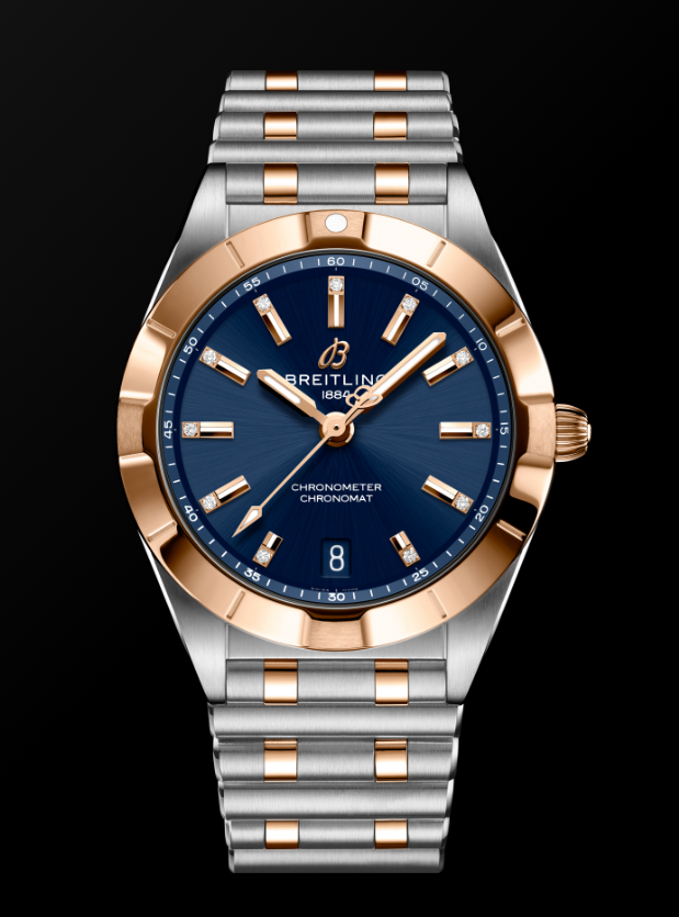 Часовник Breitling Chronomat 32 Limited Edition U773101A1C1U1 е елегантен дамски модел, съчетаващ благородна стомана и 18-каратово розово злато. Синият циферблат, инкрустиран с 11 диаманта и златни стрелки със Super-LumiNova®, създава усещане за лукс и прецизност. Лимитиран до 100 броя, този кварцов часовник с калибър Breitling 77 и водоустойчивост до 100 метра е истинско бижу за изискания вкус. Изразете стил и индивидуалност с изключителен швейцарски дизайн.