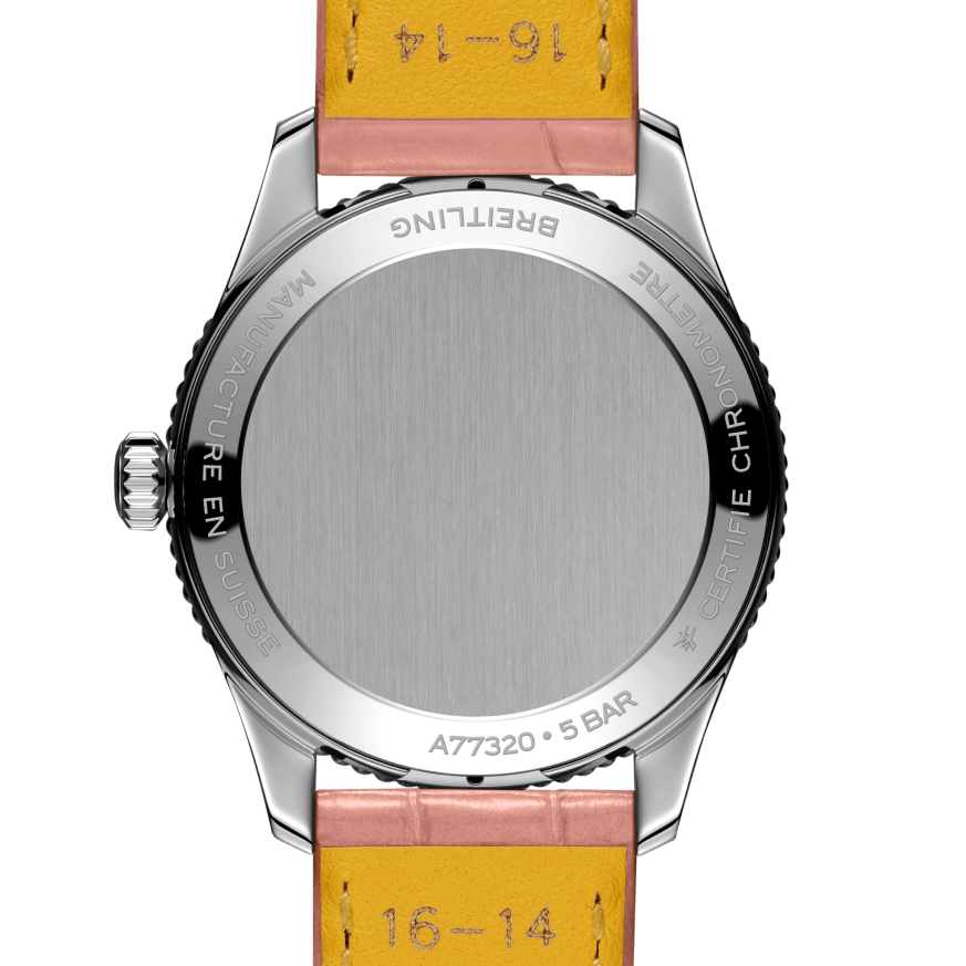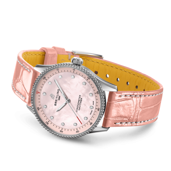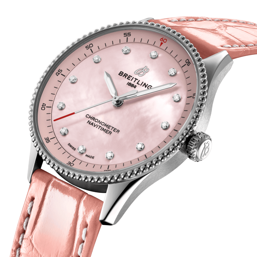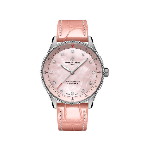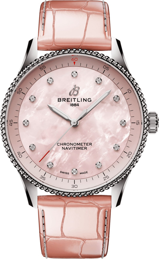 Часовник Breitling Navitimer A77320D91K1P1 е елегантен дамски модел с кварцов механизъм SuperQuartz™, перлен циферблат с 12 диаманта и каишка от алигатор. Прецизност и блясък в класически стил.