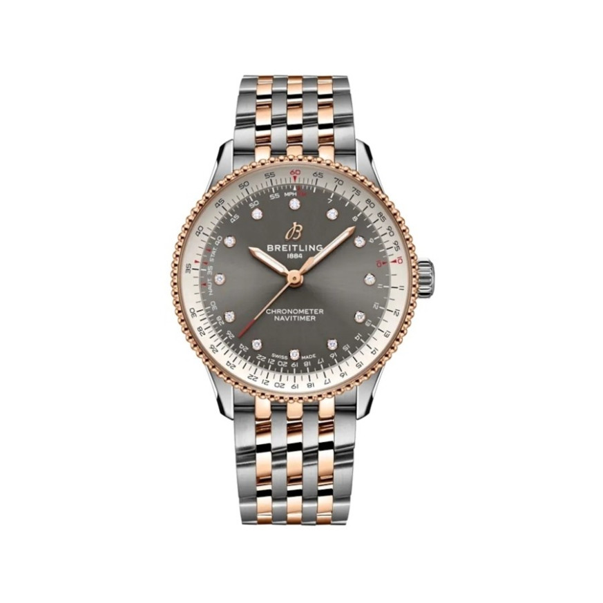 Часовник Breitling Navitimer Automatic 36 BAT Edition U173271A1B1U1 е лимитиран дамски модел със сив циферблат, 12 диаманта и двупосочен безел с логаритмична скала. Съчетава 18K розово злато, благородна стомана и COSC-сертифициран автоматичен механизъм. Само 100 броя в цял свят.