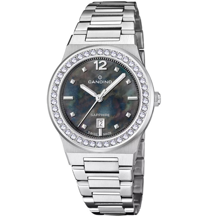 Часовник Candino C4749/D – Елегантен дамски модел от колекция Lady Casual, съчетаващ класическа визия и швейцарска прецизност. Корпусът от 316L медицинска стомана и стоманената верижка осигуряват издръжливост, докато безелът с инкрустирани камъни добавя изискан блясък. Черният седефен циферблат със сребристи индекси подчертава женствеността и стила. Сапфир-кристалното стъкло гарантира устойчивост на надрасквания, а швейцарският кварцов механизъм Harley 785 – надеждна точност. Водоустойчивостта до 5 ATM прави този часовник едновременно практичен и изискан избор за всяка дама.