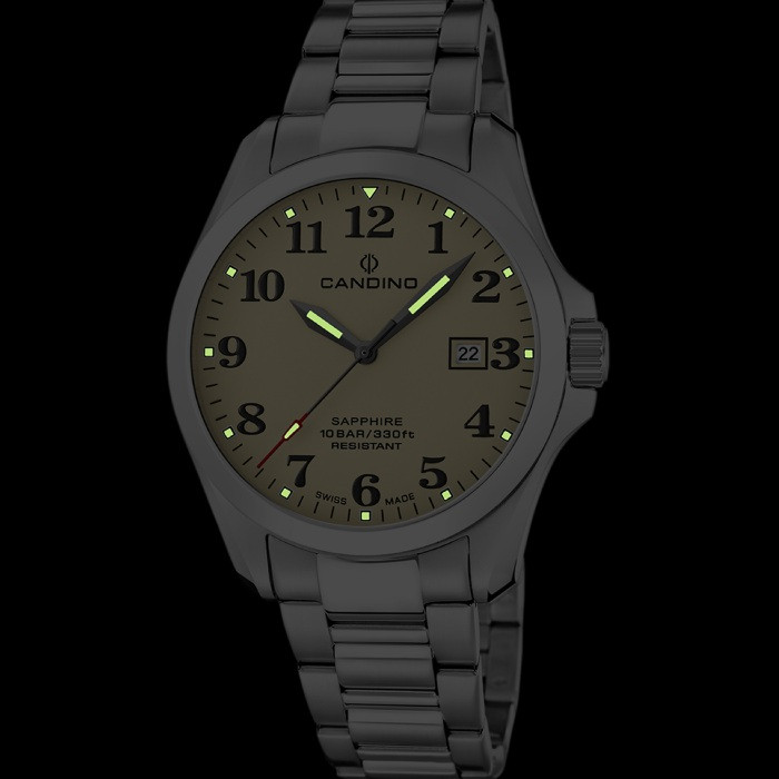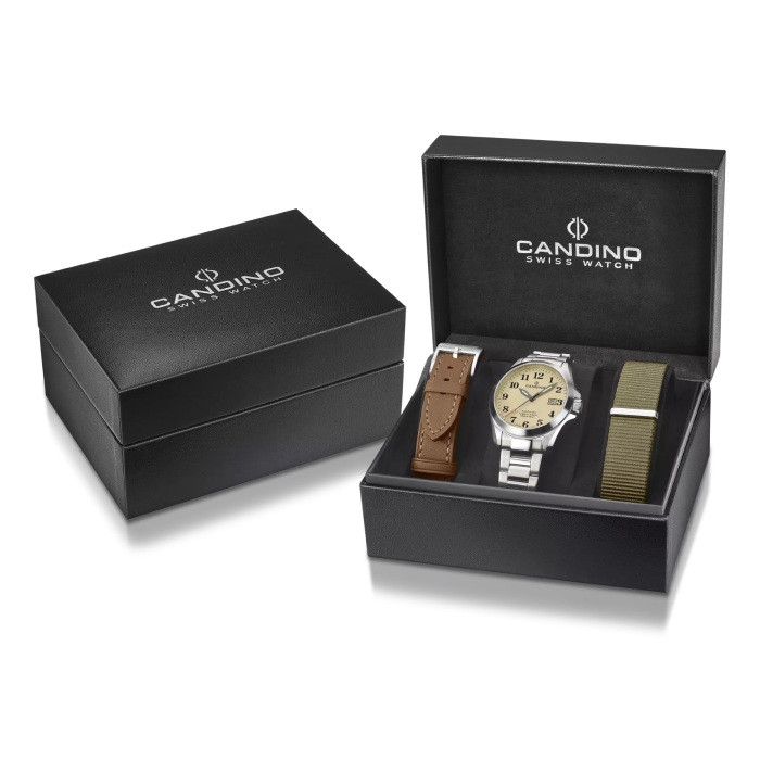 Часовник Candino C4785/1 – Мъжки модел от колекция Field, съчетаващ швейцарска прецизност и приключенски дух. Корпусът от 316L неръждаема стомана с диаметър 41.5 мм е комбиниран с бежов циферблат с арабски цифри и луминесцентно покритие. Сапфир кристалът осигурява защита от надрасквания, а кварцовият механизъм Ronda 715 гарантира точност. С водоустойчивост до 10 ATM, коронка на винт и стоманена верижка, този часовник е надежден спътник за активния и модерен мъж.