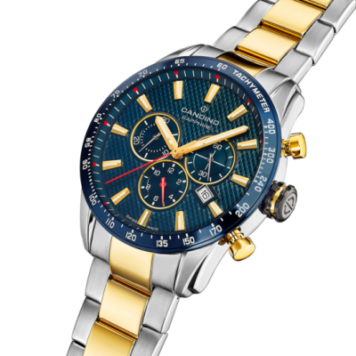 Часовник Candino C4748/2 е стилен мъжки швейцарски хронограф от серията Gents Sport, съчетаващ елегантност и функционалност. Синият циферблат с текстурирана повърхност и златисти индекси придава изтънченост, докато тахиметричната скала и хронографът осигуряват прецизност. Корпусът и верижката от неръждаема стомана с двуцветно покритие гарантират издръжливост и комфорт. Сапфиреното стъкло с антирефлексно покритие предпазва от надрасквания, а водоустойчивостта до 100 метра го прави подходящ за активен начин на живот. ClassicWatches.bg