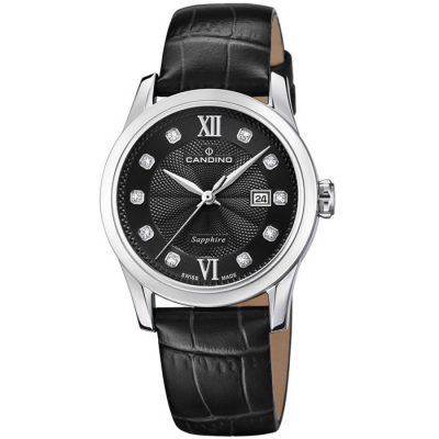 Часовник Candino C4736/4 е елегантен дамски швейцарски модел от серията Lady Elegance, съчетаващ класически дизайн и изискан стил. Черният циферблат с гилоширана текстура и кристални индекси придава изтънченост и блясък. Корпусът от неръждаема стомана 316L и черната кожена каишка осигуряват комфорт и устойчивост при носене. Сапфиреното стъкло с антирефлексно покритие предпазва от надрасквания, а водоустойчивостта до 50 метра го прави подходящ за ежедневна употреба.