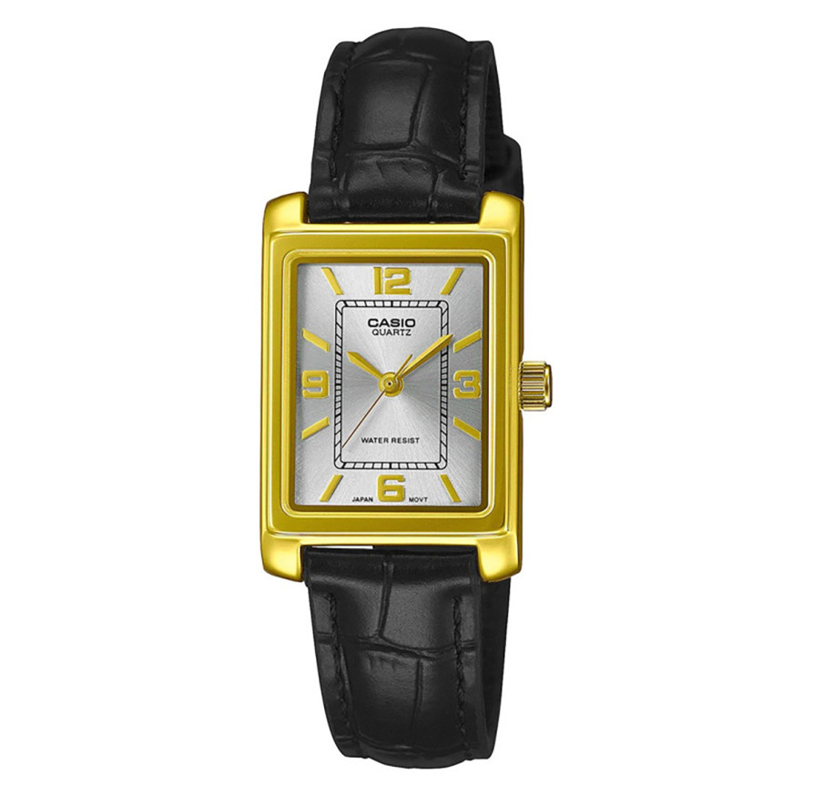 CASIO LTP-1234PGL-7A2EF е класически дамски часовник с правоъгълен корпус и изискан златист финиш. Корпусът е изработен от благородна стомана със златисто покритие, а стилната кафява кожена каишка подчертава ретро елегантността на модела. Белият циферблат е семпъл и лесен за разчитане. Минералното стъкло осигурява устойчивост на надрасквания, а кварцовият механизъм гарантира прецизна работа. С водоустойчивост до 3 ATM, моделът е идеален за ежедневна употреба с акцент върху стил и изтънченост.