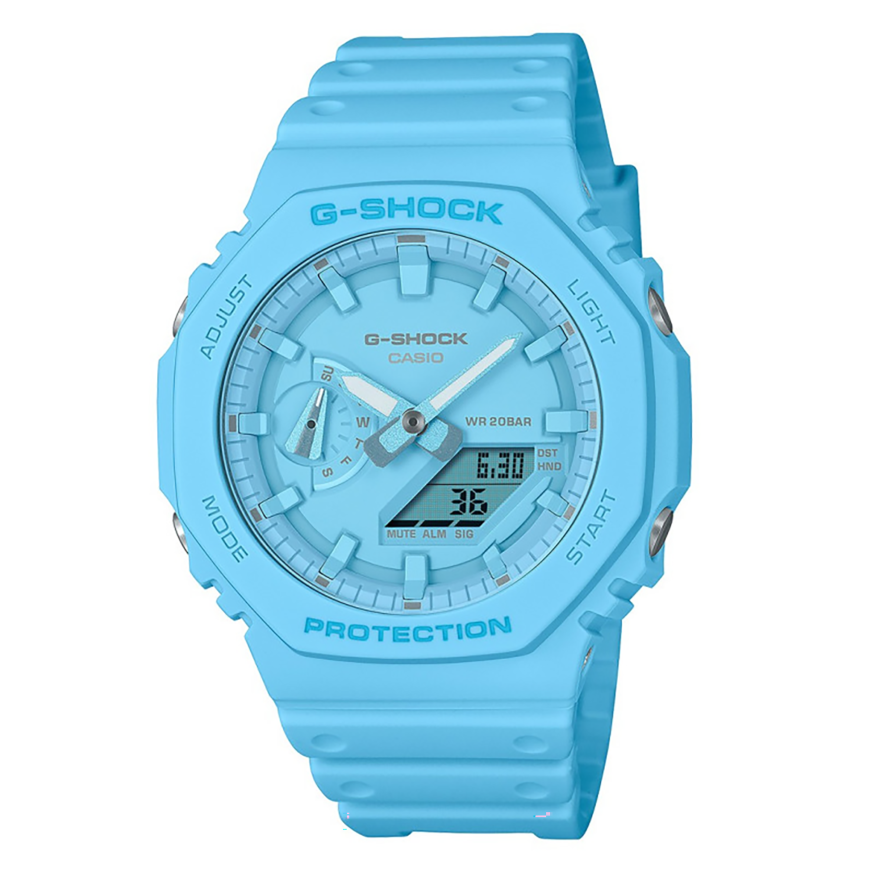 CASIO GA-2100-2A2ER от емблематичната серия G-SHOCK комбинира минималистичен стил и изключителна устойчивост. Корпусът и каишката от полимерен материал осигуряват лекота и здравина, а тъмносиният матов дизайн с аналогово-дигитален дисплей придава съвременно излъчване. Благодарение на 20 BAR водоустойчивост, удароустойчив корпус и множество функции като световно време, таймер, хронометър и 5 аларми, този часовник е създаден за активен начин на живот – без компромиси.