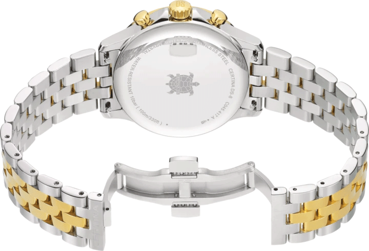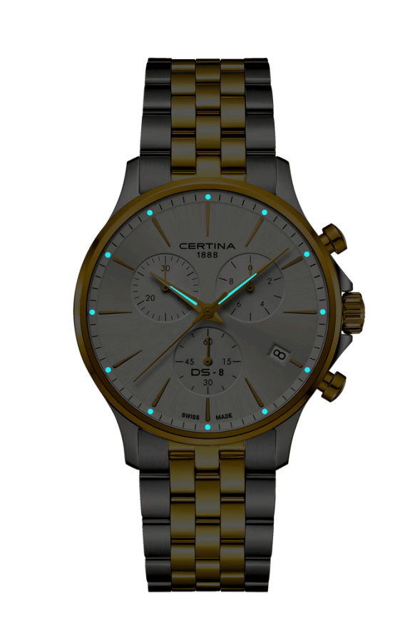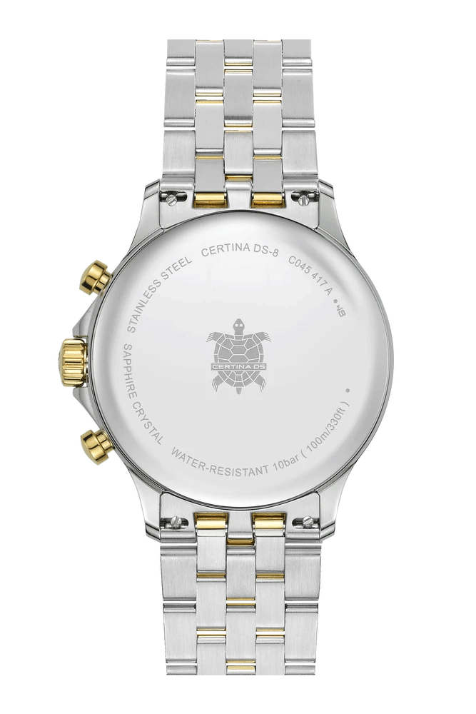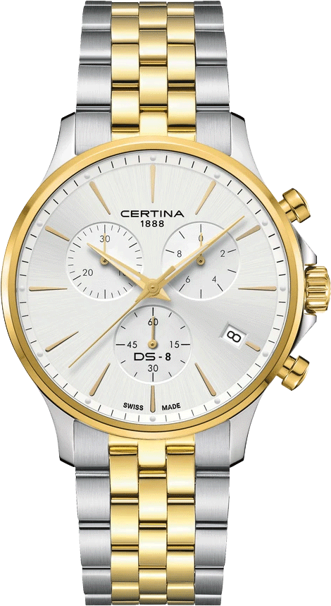 Часовник Certina DS-8 Chrono C045.417.22.031.00 е мъжки спортно-елегантен модел с кварцов механизъм G10.212, функции дата, хронограф и EOL индикатор. Сапфир кристалът и корпусът от 316L неръждаема стомана гарантират устойчивост и стил. Водоустойчивост до 100 метра и стоманена биколор верижка с пеперуда закопчаване допълват комфорта и практичността. Швейцарско качество с 2 години гаранция за надеждност и дълготрайна употреба, перфектен за активния и модерен мъж.