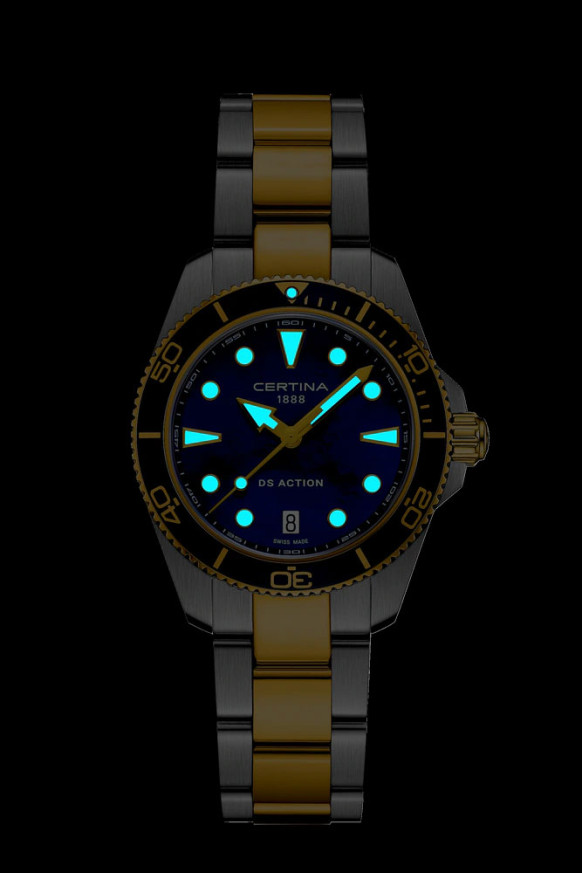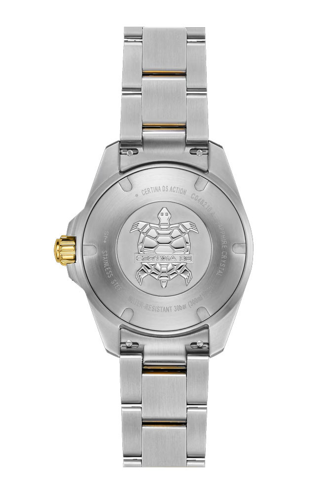 Часовник CERTINA DS Action Lady C048.210.22.131.00 е елегантен дамски модел, съчетаващ изтънчен седефен циферблат със златиста стоманена верижка с PVD покритие. Създаден по стандартите на ISO 6425, моделът е водоустойчив до 300 м, което го прави подходящ както за ежедневието, така и за професионално гмуркане. Надеждният швейцарски кварцов механизъм F05.412 осигурява прецизност и дълготрайна работа, допълнена от сапфирено стъкло и система EOL.