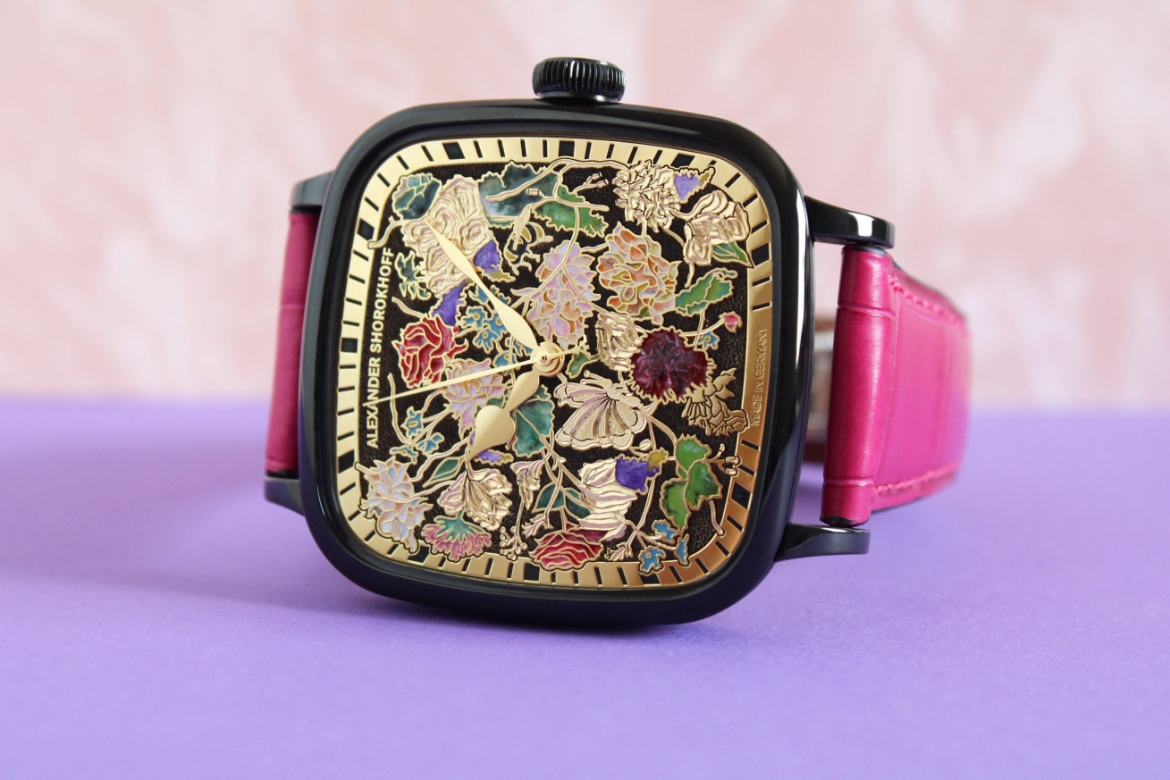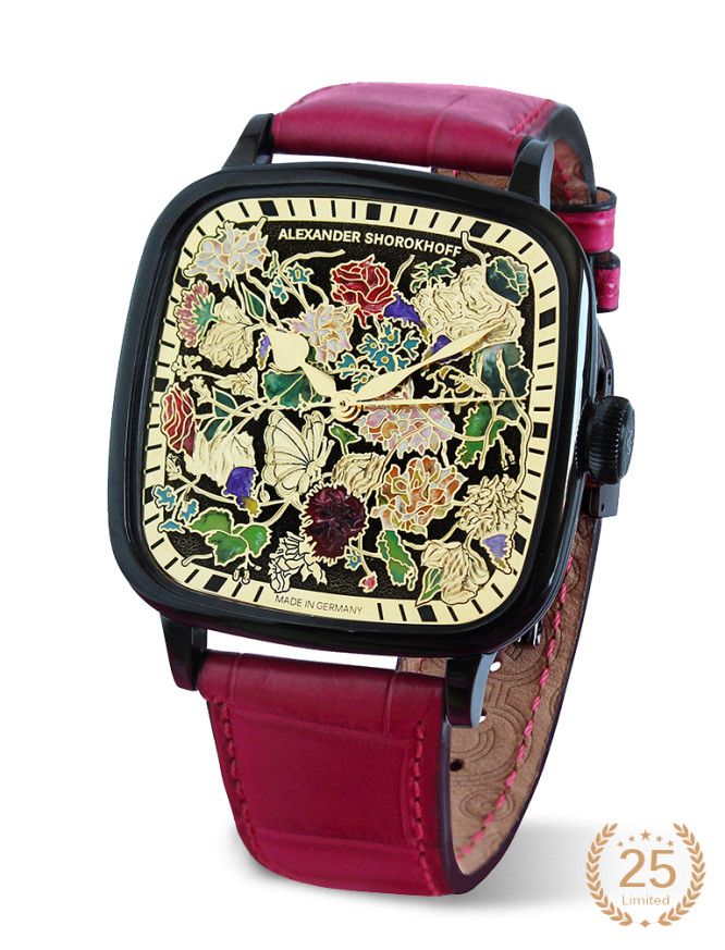 Часовник ALEXANDER SHOROKHOFF BELLA & ALLA AS.KD02-B&A е лимитиран модел, създаден като символ на любовта. Корпусът с черно PVD покритие и ръчно емайлиран циферблат с флорални мотиви придават изключителна художествена стойност. Механизмът ETA 2892 е автоматичен, с ръчно гравиран ротор и 47 часа резерв. Каишката от естествена кожа на алигатор в цвят фуксия допълва изразителния дизайн. Само 25 броя – достъпни в ClassicWatches.bg.