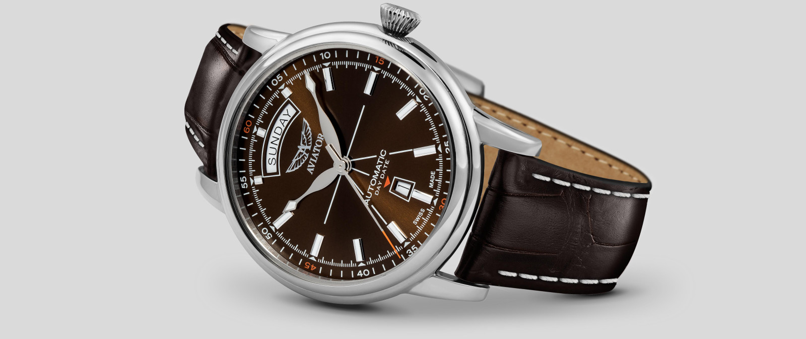AVIATOR Douglas Day Date впечатлява с изящна слънчева шлифовка на циферблата, елегантно извито прозорец за деня и трапецовидна дата, които допълват класическия облик. Тъй като четливостта и прегледността са ключови характеристики, колекцията Douglas Day Date съчетава Арт Деко дизайн и функционалност в перфектна хармония.