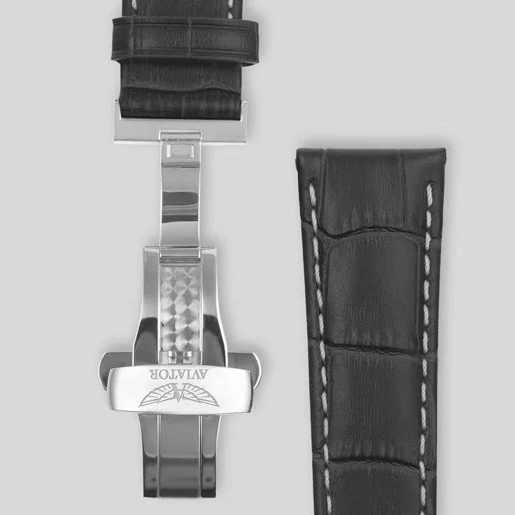Изработена от най-качествени материали, всяка каишка AVIATOR е създадена, за да отразява духа на колекцията. Този модел разполага с луксозна каишка от кожа с алигаторски мотив, преминала специален процес на дъбене, за да осигури мека текстура и гъвкавост.