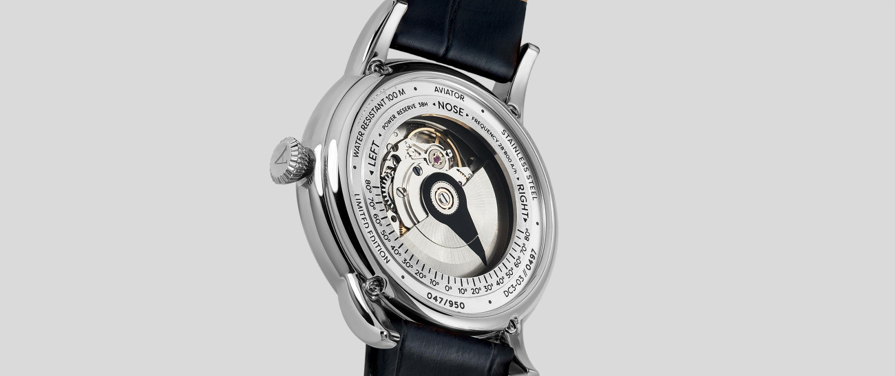 Задният капак на корпуса е вдъхновен от прибора за управление на кормилото в пилотската кабина на Douglas DC-3. Той отразява функционалността, която изчислява ъглите на отклонение на кормилото и контролира позицията на самолета. Тази уникална детайлност е защитена със специално стъкло, което предпазва от надрасквания и удари, като същевременно осигурява комфортно прилягане на китката. Всеки AVIATOR Douglas е създаден с изключително внимание към детайлите – комбинация от авиационно наследство и фино часовникарско майсторство, неподвластна на времето.