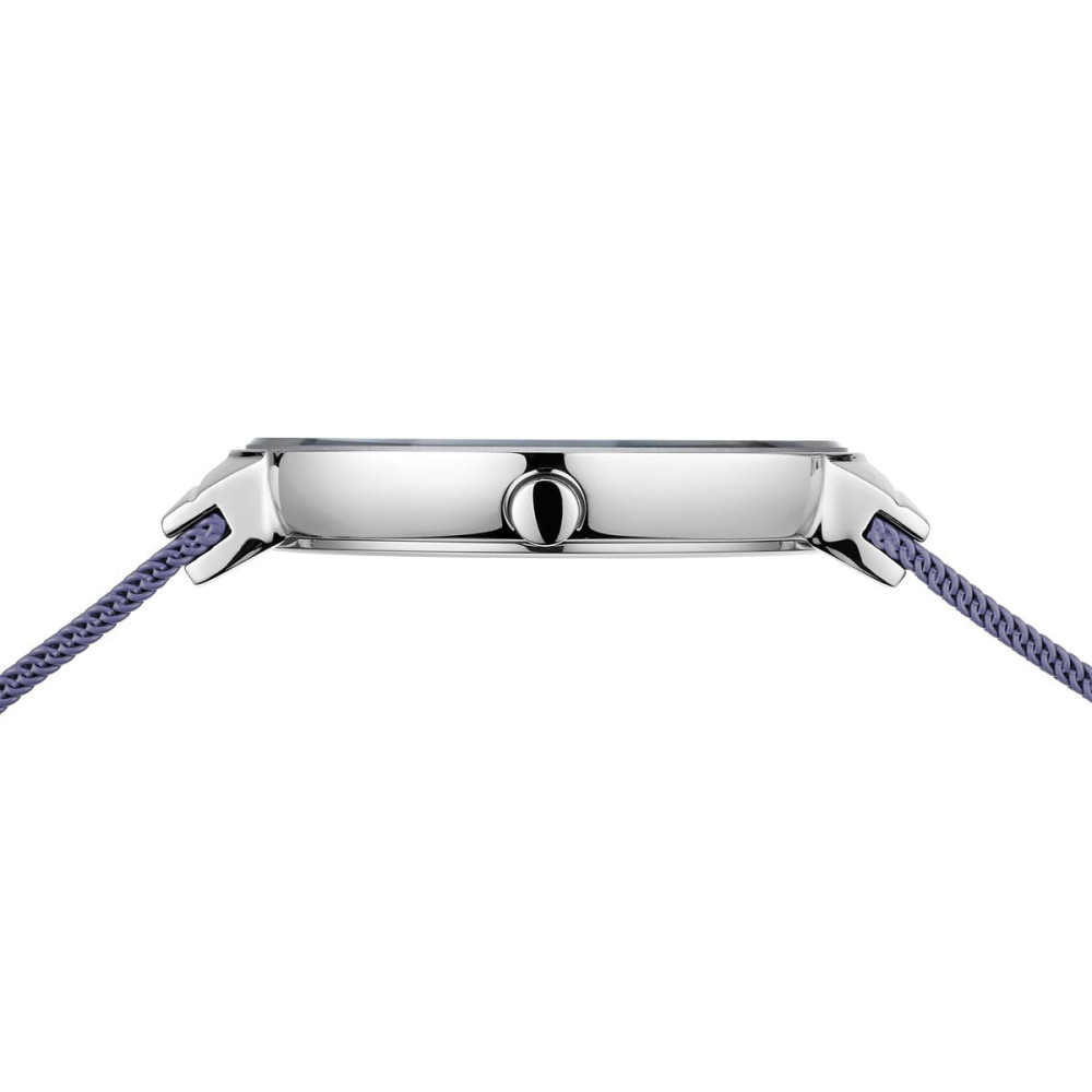 Цветовете на Арктика – толкова ясни, толкова уникални.BERING 10135-908 прави смело изявление, без да е крещящ. Съвременната му цветова палитра от меко лавандулово синьо и полирана сребърна неръждаема стомана напомня за деликатното сияние на арктическото небе привечер. Виолетовият циферблат със слънчеви лъчи улавя светлината с елегантност – грациозно взаимодействие на дълбочина и отражение. Дванадесет кристала Swarovski придават изискан блясък на минималистичния му дизайн.