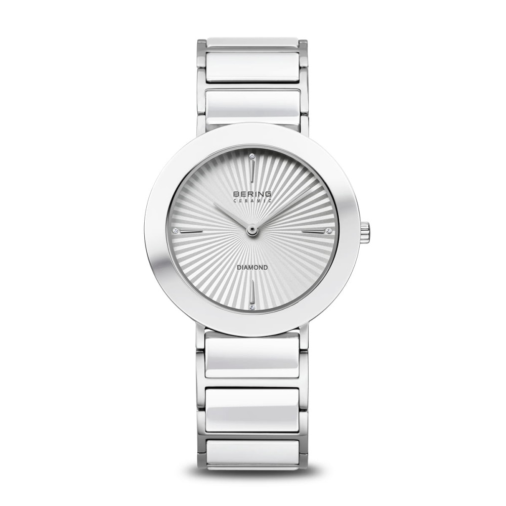 Със своята хладна, изчистена естетика, този часовник от колекцията BERING Classic е елегантно изявление за жени, които държат на стила. Кръглият корпус от полирана неръждаема стомана е обрамчен от високогланцов бял керамичен безел – материал, ценен не само заради изисканата си текстура, но и заради устойчивостта си на надраскване и дълготрайността си.