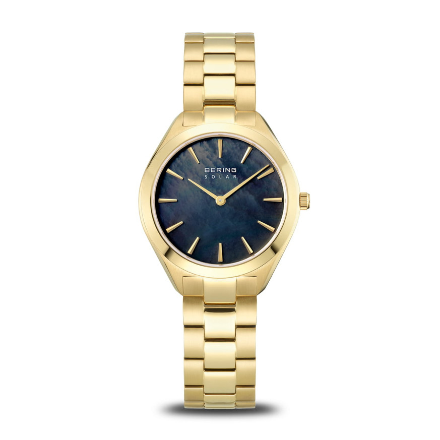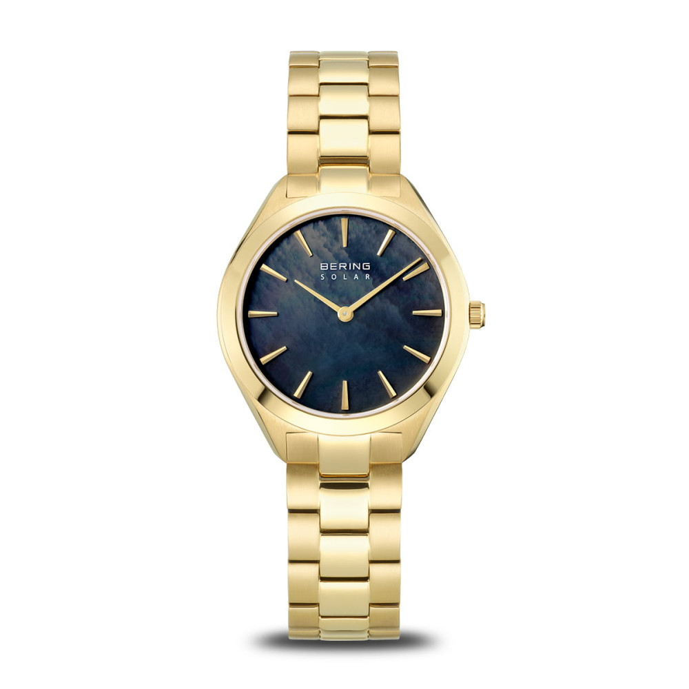 Слънчевата енергия среща златната елегантност – израз на времето и лекотата.Този дамски часовник от колекцията BERING Solar съчетава модерни технологии с луксозен дизайн. Циферблатът от истински седеф в наситено синьо улавя светлината като арктическото вечерно небе – мистериозно и постоянно променящо се. Тънките златни индекси и стрелки подчертават изискания му характер и подчертават чистотата на дизайна.Полираният корпус и верижка от неръждаема стомана в златист цвят придават на часовника сияйно, женствено присъствие. Благодарение на слънчевата технология, механизмът се зарежда от всеки източник на светлина – слънчева или изкуствена – и работи надеждно в продължение на месеци без смяна на батерията.