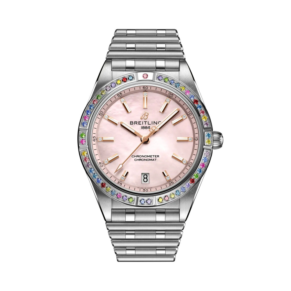Часовник Breitling Chronomat Automatic 36 South Sea Capsule Collection G10380BB1K1G1 е изключителен дамски модел, съчетаващ лукс, елегантност и швейцарска прецизност. С корпус от стомана, безел от 18К бяло злато, розов перлен циферблат с 11 диаманта и автоматичен механизъм Breitling 10, този часовник е COSC сертифициран и водоустойчив до 100 м. Идеален за жени, които ценят изискания стил и надеждността на престижния швейцарски часовникар.