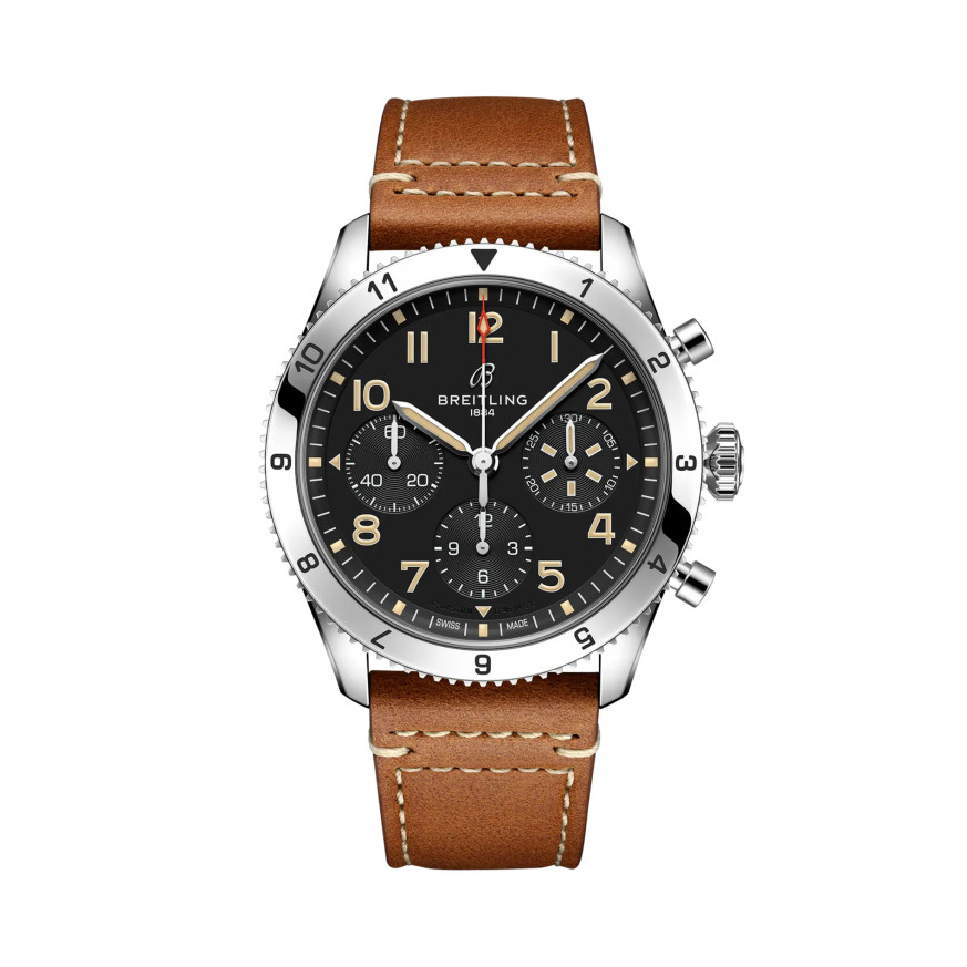 Часовник Breitling Classic AVI Chronograph 42 P-51 Mustang A233803A1B1X1 отдава почит на легендарния военен самолет, съчетавайки автентичен пилотски дух с модерна швейцарска прецизност. С автоматичен механизъм Breitling Calibre 23 (COSC сертифициран), моделът предлага хронограф с 48-часов енергиен резерв. Черният циферблат с Super-LumiNova® стрелки осигурява отлична четимост. Водоустойчив до 100 м и изработен от благородна стомана, Classic AVI е завършен с кожена каишка от телешка кожа, вдъхновена от авиационното наследство.
