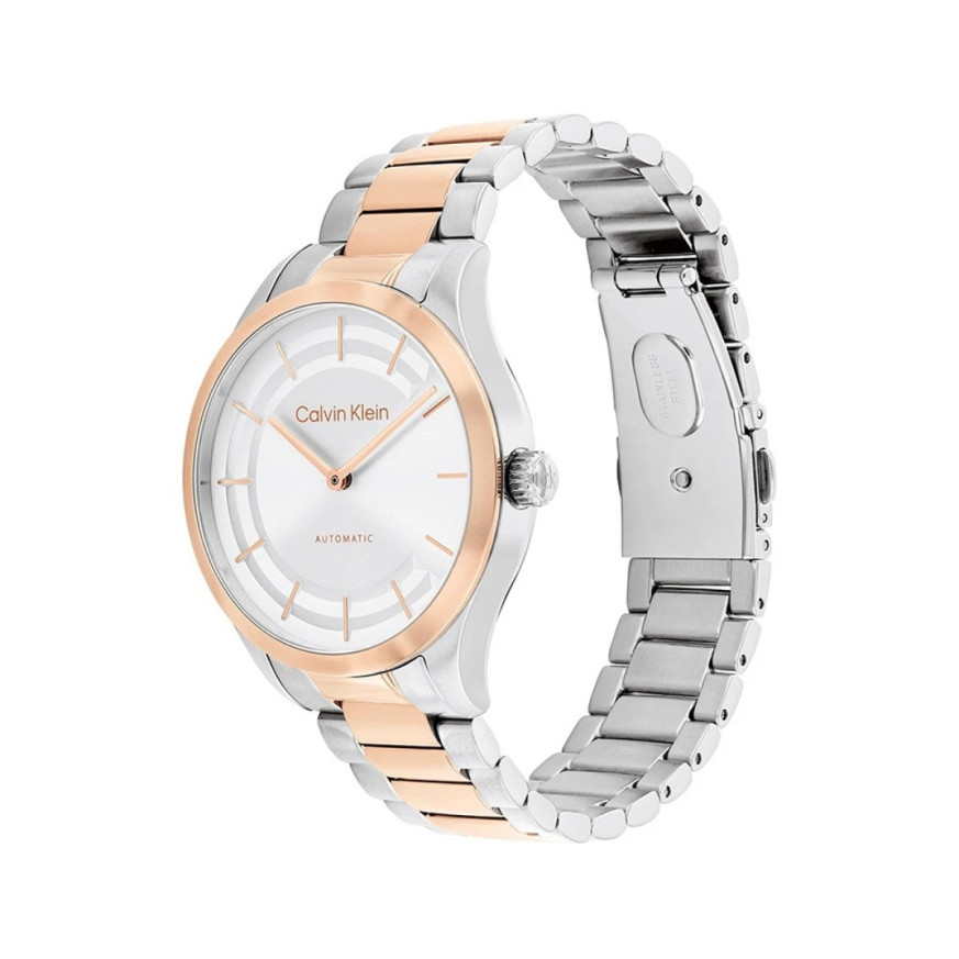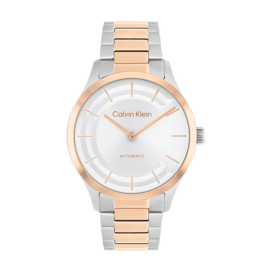 Часовник Calvin Klein Iconic 25100104 е спортно-елегантен дамски модел с автоматичен механизъм, задвижван от движението на ръката. Изработен от неръждаема стомана с розово златисто покритие по безела и част от верижката, този часовник впечатлява със светъл циферблат и розово златисти стрелки.