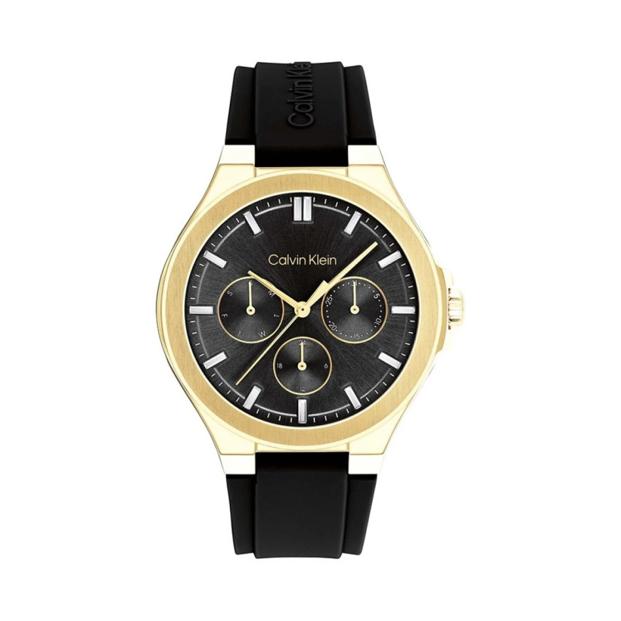 Часовник Calvin Klein Vibrancy 25100107 е стилен дамски модел с модерна спортно-елегантна визия. Корпусът е изработен от неръждаема стомана със златисто покритие, комбиниран с удобна черна силиконова каишка. Черният мултифункционален циферблат със сребристи индекси и златисти стрелки предлага функции за дата, ден от седмицата и 24-часов формат.